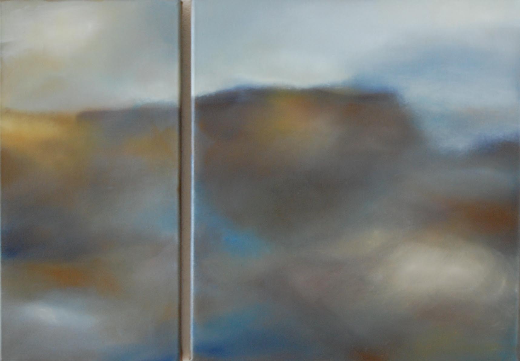 Comme technique, j’utilise la peinture à l’huile, dans les premières couches diluée à la térébenthine, puis de plus en plus grasse. Une toile achevée contient de nombreuses applications successives presque transparentes, ce qui demande d’attendre, entre chaque couche, le durcissement de la couche précédente.